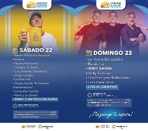 En esta oportunidad también se espera la presentación de números musicales de alcance nacional como LOS ALONSITOS, el día domingo 23, y PINKY SD (un poco de ruido), el sábado 22.
